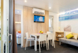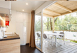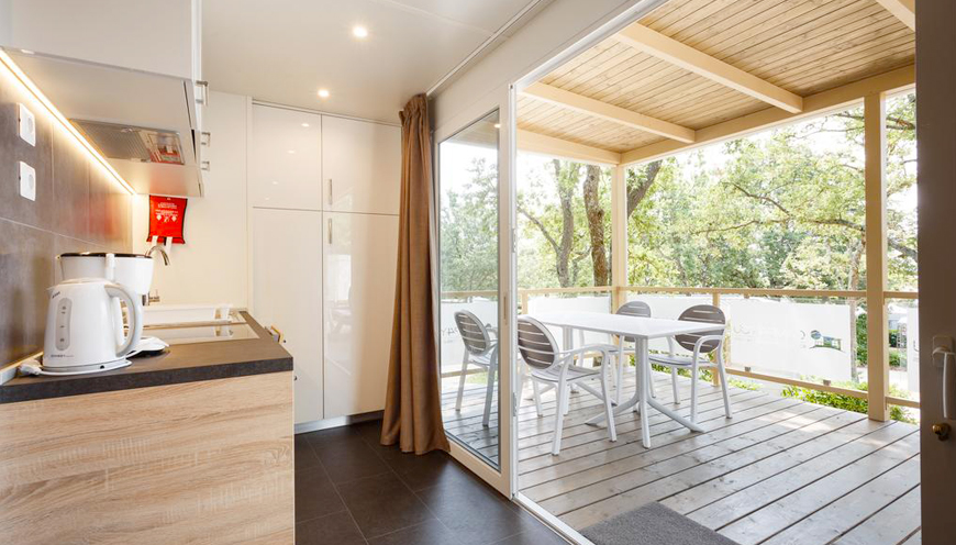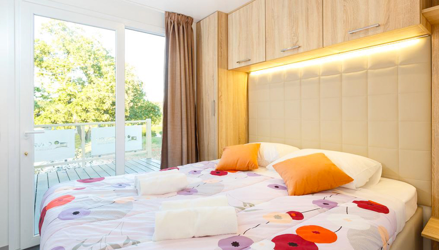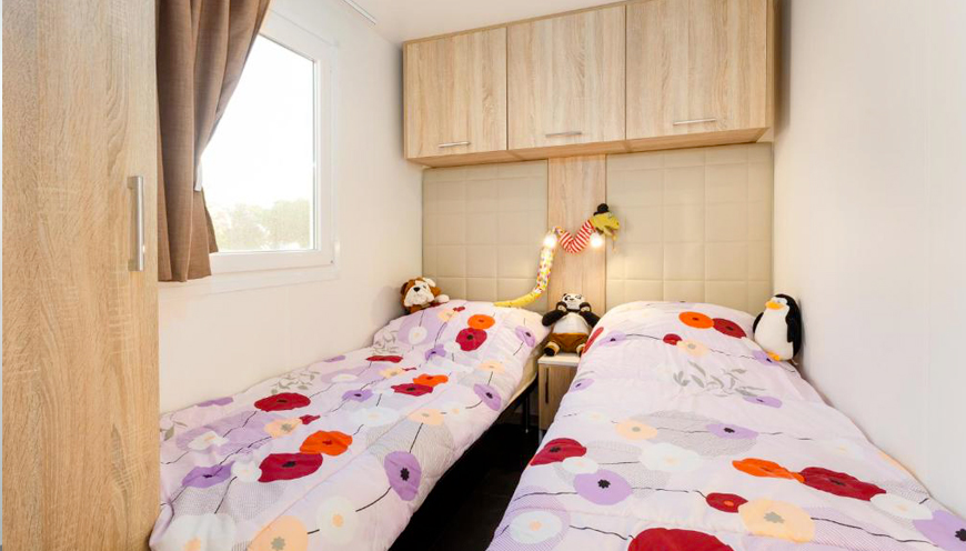 The mobile home is really beautiful, big enough for 2 people and fully equipted. Kitchen has a dish washer which is great! The bed is really comfortable, bathroom nice and big shower with different options of running water. If you close all the windows, you can hardly hear voices from outside, which I think its great! The Solaris camp, where the houses are, is really peacefull and good, you have 1 min to the beach and you can see the sea if you look from the terrace, if you are staying in the first row. Terrace is quite big and it also have a little garden which you can use for sunbathing. Me and my partner likes to come here and I recommend it, if you like peaceful vacation.