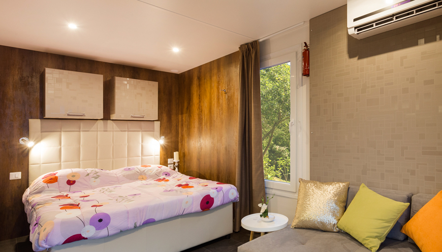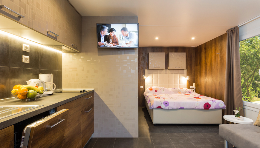 The mobile home is really beautiful, big enough for 2 people and fully equipted. Kitchen has a dish washer which is great! The bed is really comfortable, bathroom nice and big shower with different options of running water. If you close all the windows, you can hardly hear voices from outside, which I think its great! The Solaris camp, where the houses are, is really peacefull and good, you have 1 min to the beach and you can see the sea if you look from the terrace, if you are staying in the first row. Terrace is quite big and it also have a little garden which you can use for sunbathing. Me and my partner likes to come here and I recommend it, if you like peaceful vacation.